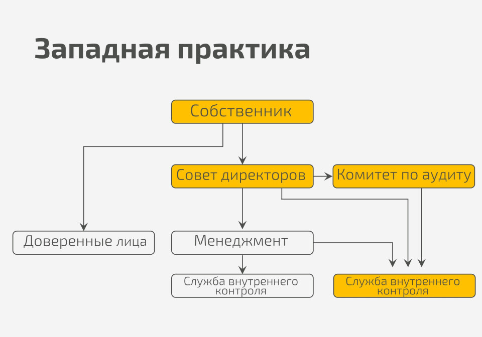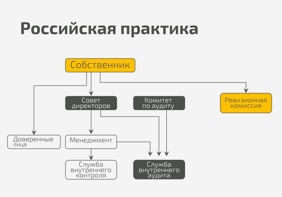 Чтобы разобраться, так ли это на самом деле и хороша ли такая замена для инвесторов, покупающих облигации или акции ПАО, начнем разбираться с самого устройства системы акционерного (владельческого) контроля в акционерном обществе. Если взять типичные западные практики, то кроме неформального института доверенных лиц владельца главным системным элементом контроля является совет директоров, в котором создается комитет по аудиту, которому в свою очередь подотчетна служба внутреннего аудита. При этом, типовой практикой является назначение и увольнение руководителя службы внутреннего аудита решением совета директоров, что делает его менее зависимым от менеджмента, действия как раз которого служба должна проверять и контролировать.