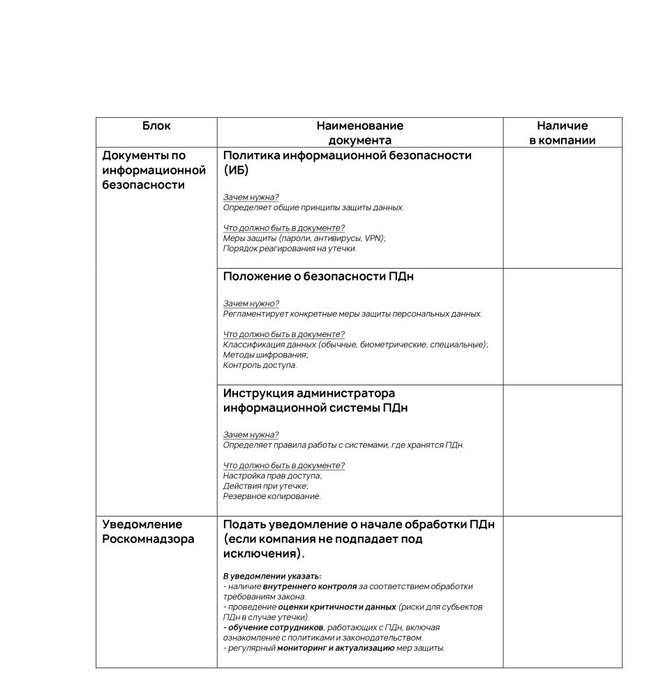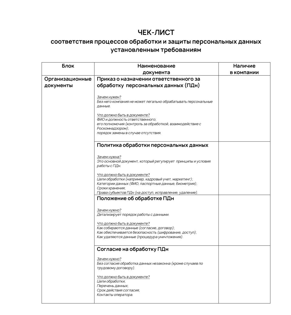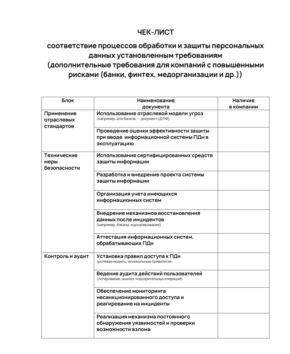 Вместе с тем, совместно с экспертом в области информационной безопасности по организационным и техническим мерам (начиная от работы в регуляторе, заканчивая построением систем информационной безопасности для социальных сетей) Артемом Бердашкевичем мы подготовили расширенный чек-лист, который поможет компаниям разных масштабов и отраслевой специфики (включая банковский сектор) привести свою работу с персональными данными в соответствие с законом.