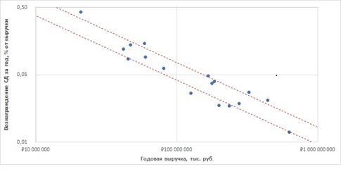 При детальном исследовании выявлена любопытная статистическая закономерность: расходы на весь совет директоров, выраженные в процентах от выручки, снижается при росте выручки. Например, вид такой зависимости представлен на графике 2 для компаний из второй группы.