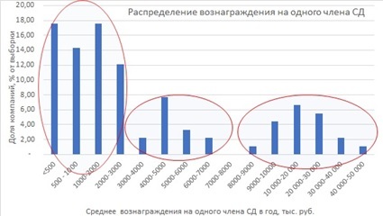Средний размер вознаграждения на весь совет директоров в год составляет 0,3% (минимальный 0,001%, максимальный 7,3%) от годовой выручки компании.